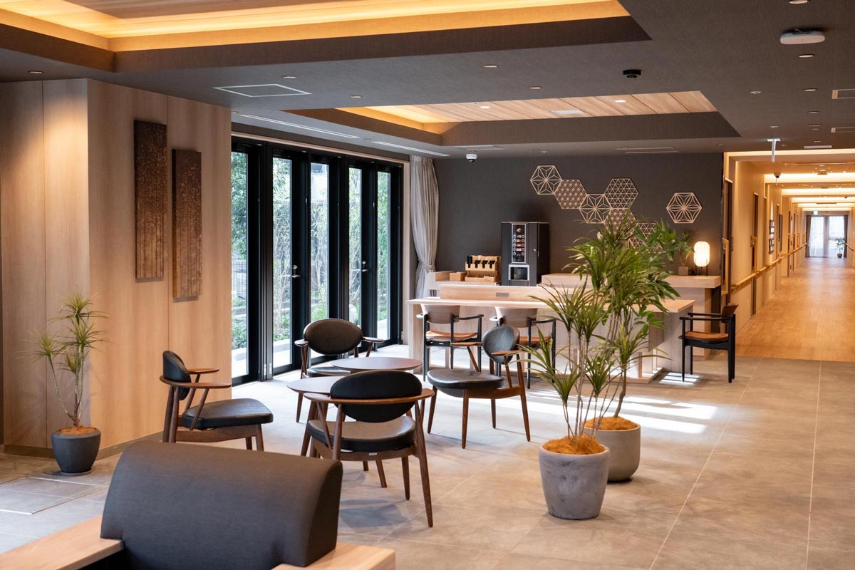 施設は5階建て。各居室フロアにはコンセプトの違う多目的室があり、茶道やカードゲーム、ヨガやワークショップなど、さまざまな催しが開催されています(写真はエントランス)。